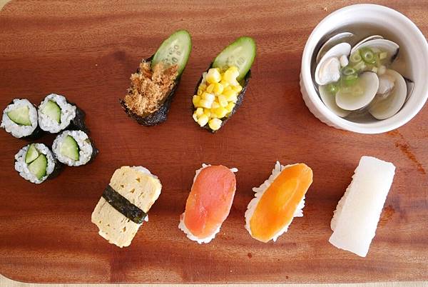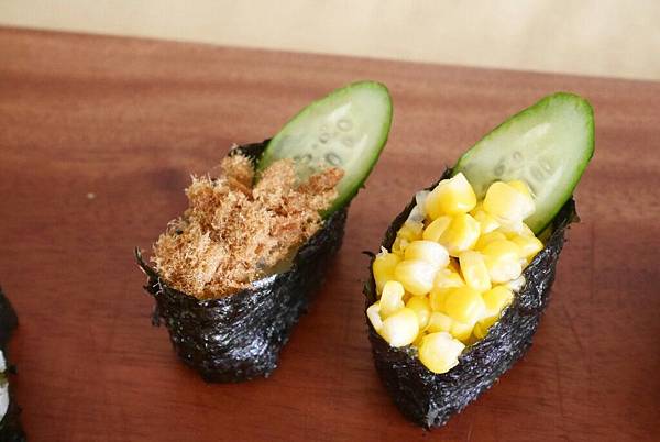 - 玉米軍艦:水煮玉米粒、海苔、小黃瓜