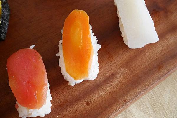 - 鮭魚生魚片:胡蘿蔔切片蒸熟