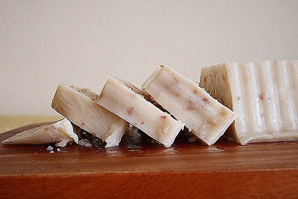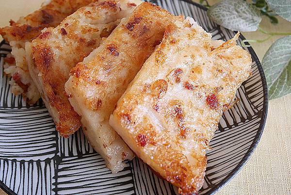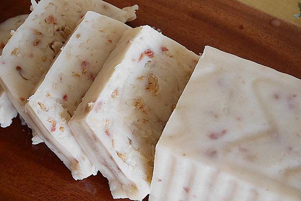 因為是直接在鋁箔盒內蒸熟,所以蘿蔔糕切片呈現了富士山的形狀,真的是超可愛 :)